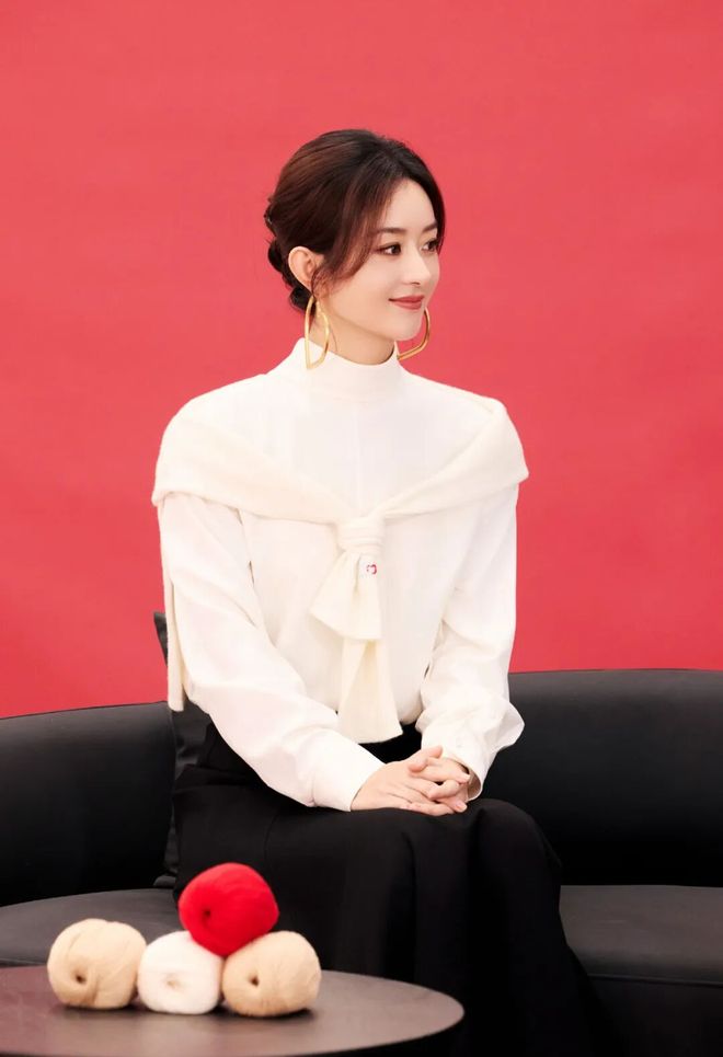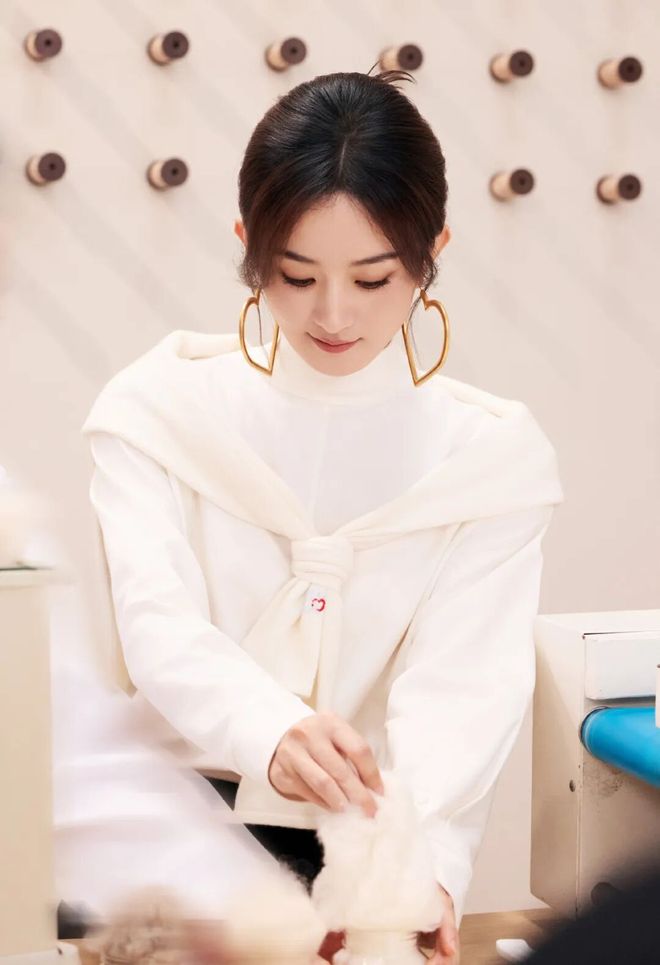 其实这是赵丽颖当晚参加品牌直播活动的造型,纯白羊绒毛衣搭配黑色半身裙,很大气温柔的感觉,金色超大心形耳饰成为整体造型的焦点,让这份温柔也变得锋利起来。