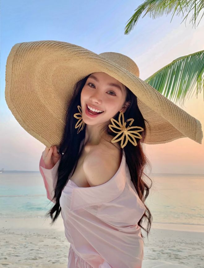 易梦玲最近去海岛度假也带了超大号的配饰——耳环和帽子都是超大号的!这顶度假风十足的帽子被她说像飞饼一样,美丽的花朵散落其中,你别说这份比喻还挺生动,饿了。