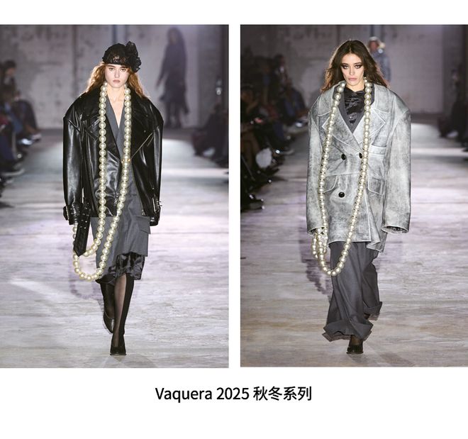 Vaquera是由四位设计师于2013年在纽约创立的时尚品牌,其名称在西班牙语中意为“女牛仔”,寓意自由与反叛精神。品牌以先锋、无性别和实验性设计著称,擅长打破常规,将日常服饰通过夸张手法重新演绎。在2025秋冬系列中,Vaquera延续了其张扬的设计风格,大量运用了极具视觉冲击力的超大型配饰:Oversize珍珠项链、宽大腰带以及齐肩宽的蝴蝶结帽饰成为造型亮点;而更具戏谑意味的是,胸罩也被“巨物化”作为上衣出现在秀场上,搭配剪裁利落的裤装,既荒诞又别致,展现出品牌一贯的感官冲击力。