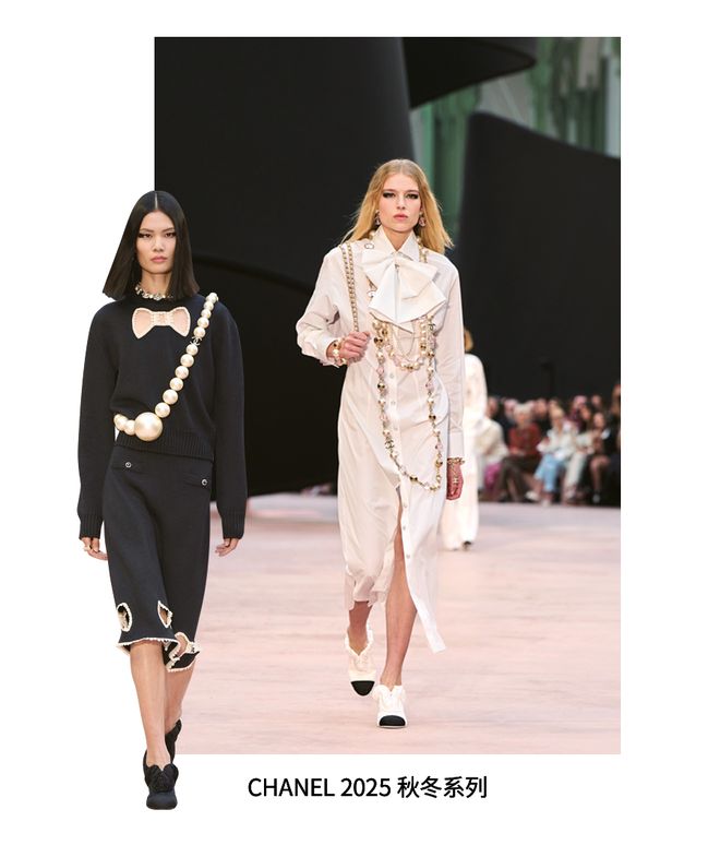 CHANEL 2025秋冬系列以现代艺术语言呼应品牌创始人 Coco Chanel留下的美学印记。整个系列由RueCambon工坊匠心打造,延续高定系列的设计思路,在经典风格中注入流动的呼吸感。本季紧扣品牌经典的设计元素,以蝴蝶结、斜纹软呢与珍珠三大标志符号为轴线展开叙事。层次感穿搭贯穿全场:无论是裙装与长裤共存的套装,还是从牛仔渐变至雪纺的半透明造型,皆在虚实之间演绎出 CHANEL当代的穿衣哲学。