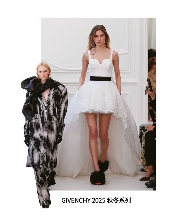 在设计师Burton的手中,剪裁和比例成为一种充满张力的美学语言。她将GIVENCHY标志性的建筑感在配饰的表现上推向了极致:本季的耳饰绝非配角,而是成为了紧贴模特脸颊的微型建筑。超大体量的金属或树脂耳环,以不规则的几何形态存在,其重量与模特行走时的动态形成巧妙平衡,共同强化了那种不容忽视的、充满力量感的女性气场。巨大的蝴蝶结也不再是传统的甜美符号,而是以挺括的面料构筑成充满戏剧性的颈部装饰,其夸张的体量打破了上装既有的轮廓,成为整体造型的视觉焦点。